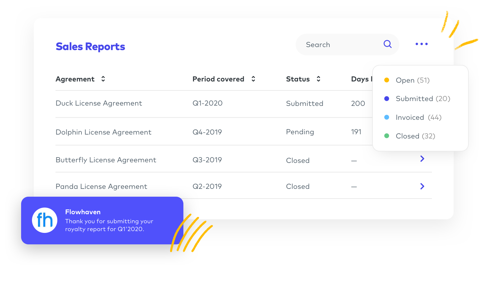We’re bringing licensing to the 21st century, replacing slow progress and complexity with smart features and collaboration. You can do it all on Flowhaven.